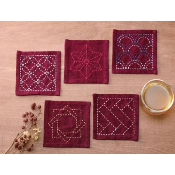 Japanese traditional stitching technique, which is very easy to learn. Its stitching lines make simple and beautiful patterns on the cloth. This contains a 6in x 26.5in cloth with designs for 5 coasters. The finished size of each coaster is 4in x 4in. Printed in Japanese. Color: Red